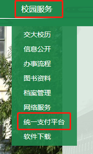 点击导航栏“校园服务”下的“统一支付平台”(http://zxjf.ecjtu.edu.cn/)。